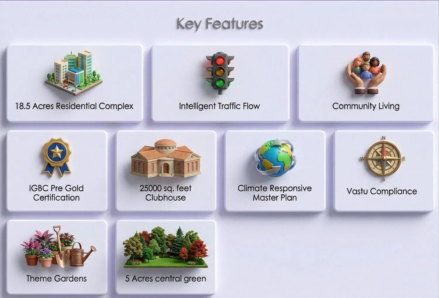 The project is designed with large open areas, landscaped gardens, and pedestrian-friendly spaces to provide a healthy living environment.